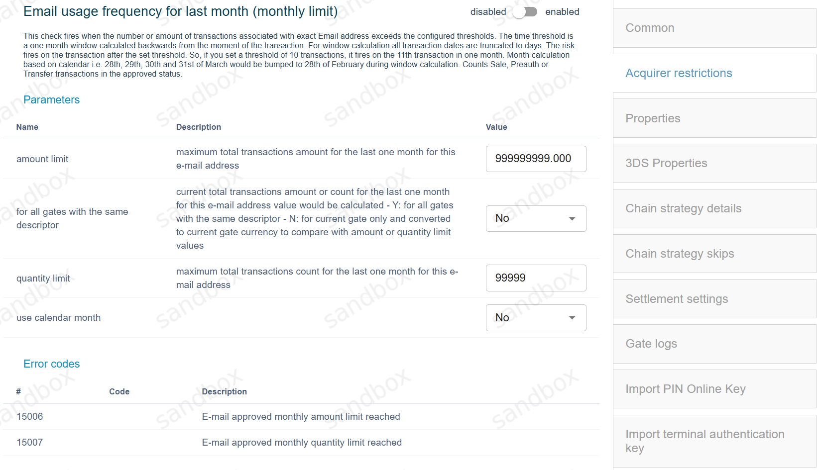 This functionality allows to set internal filters and prevent non-successful processing of transactions on gates which have specific limitations. To switch these limitations on, go to the required gate and click on the “Acquirer restrictions” tab.