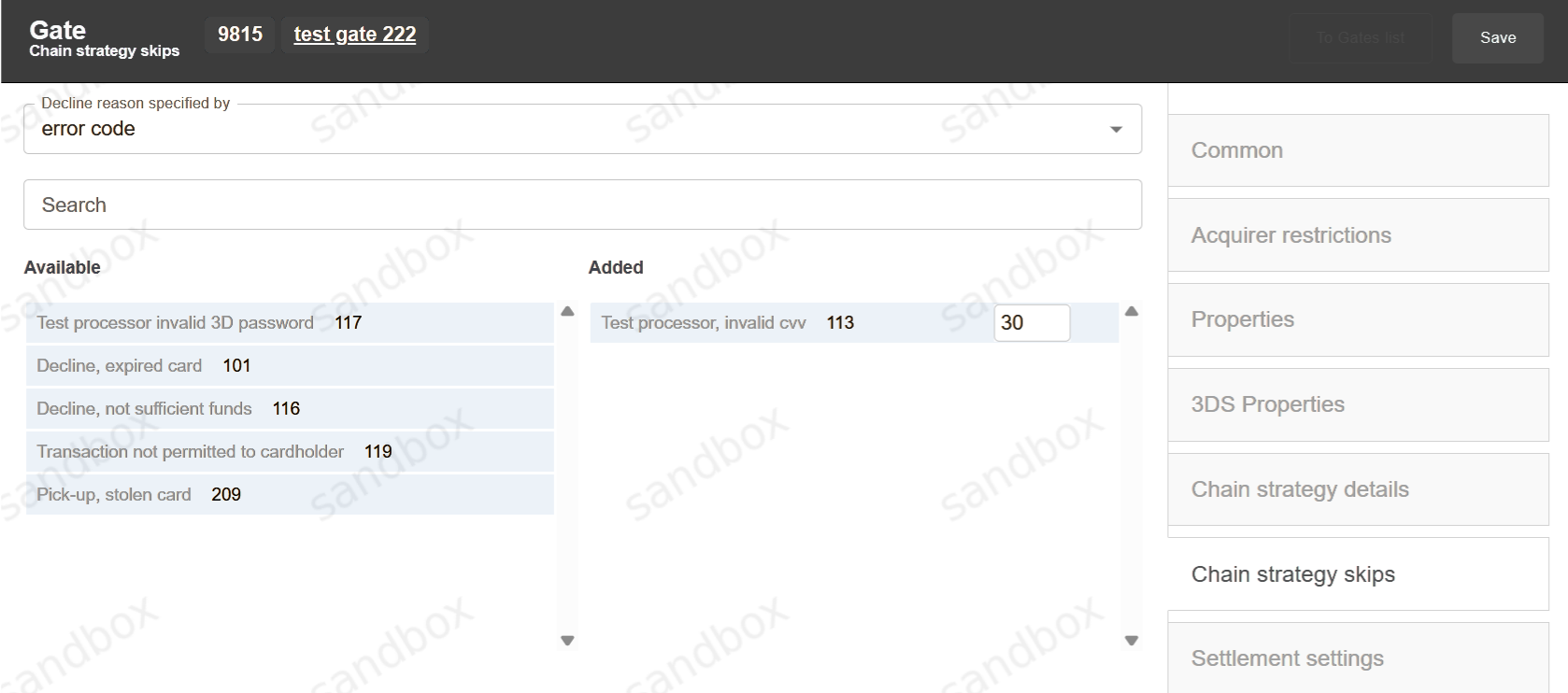 Chain strategy skips allows to skip a gate per PAN for a transaction if one of selected errors codes occur. After transaction is declined for a specific PAN on one gate, this gate will be skipped from cascading on next transactions with the same PAN for the specified time period (set in minutes).