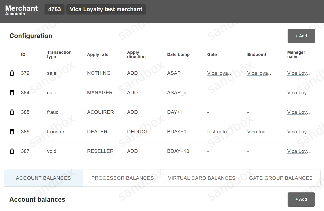 To add new account configuration press +Add button in configuration field and set up the transaction type and rates, which will add or deduct funds from balance by settings described in Accounts Configuration. Optionally, gate and endpoint can be selected - if they are left empty, balance configuration will work for all gates and endpoints of selected Merchant.